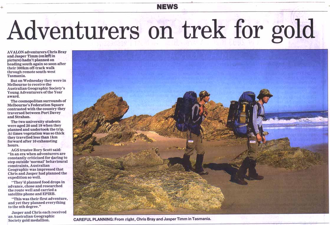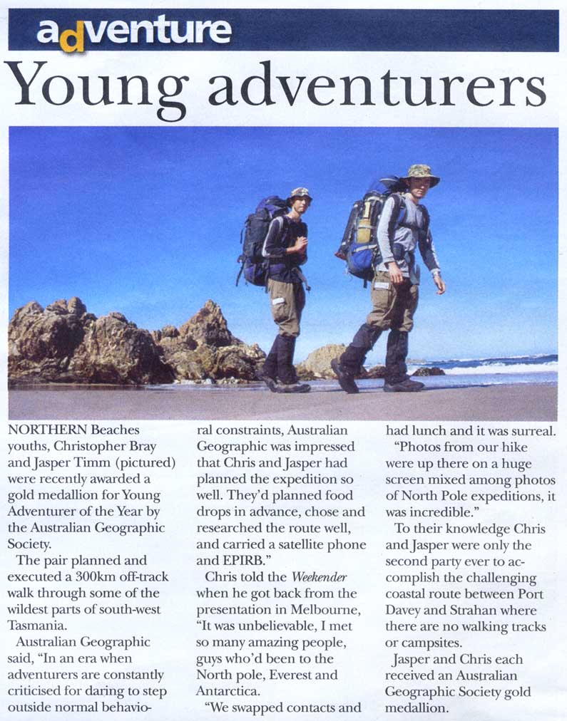 The Manly Daily, a Northern Sydney newspaper (the largest suburban daily newspaper in the world), published this news article entitled 'Adventurers on trek for gold', on Thurs 11th June 2004 detailing our 'Young Adventurer of the Year' award, illustrated with a photograph from our hike.