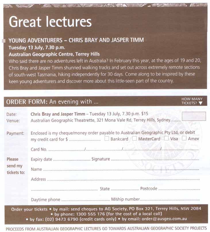 Australian Geographic Presentation - On Tuesday 13th July 2004, Chris Bray & Jasper Timm are presenting a one hour lecture / slideshow on this adventure, hosted by Australian Geographic Society at their Terrey Hills Headquarters. Tickets are $15, with all proceeds going to Australian Geographic Society to help support other adventures in the future. Please call 1300 555 176 for bookings and further information.