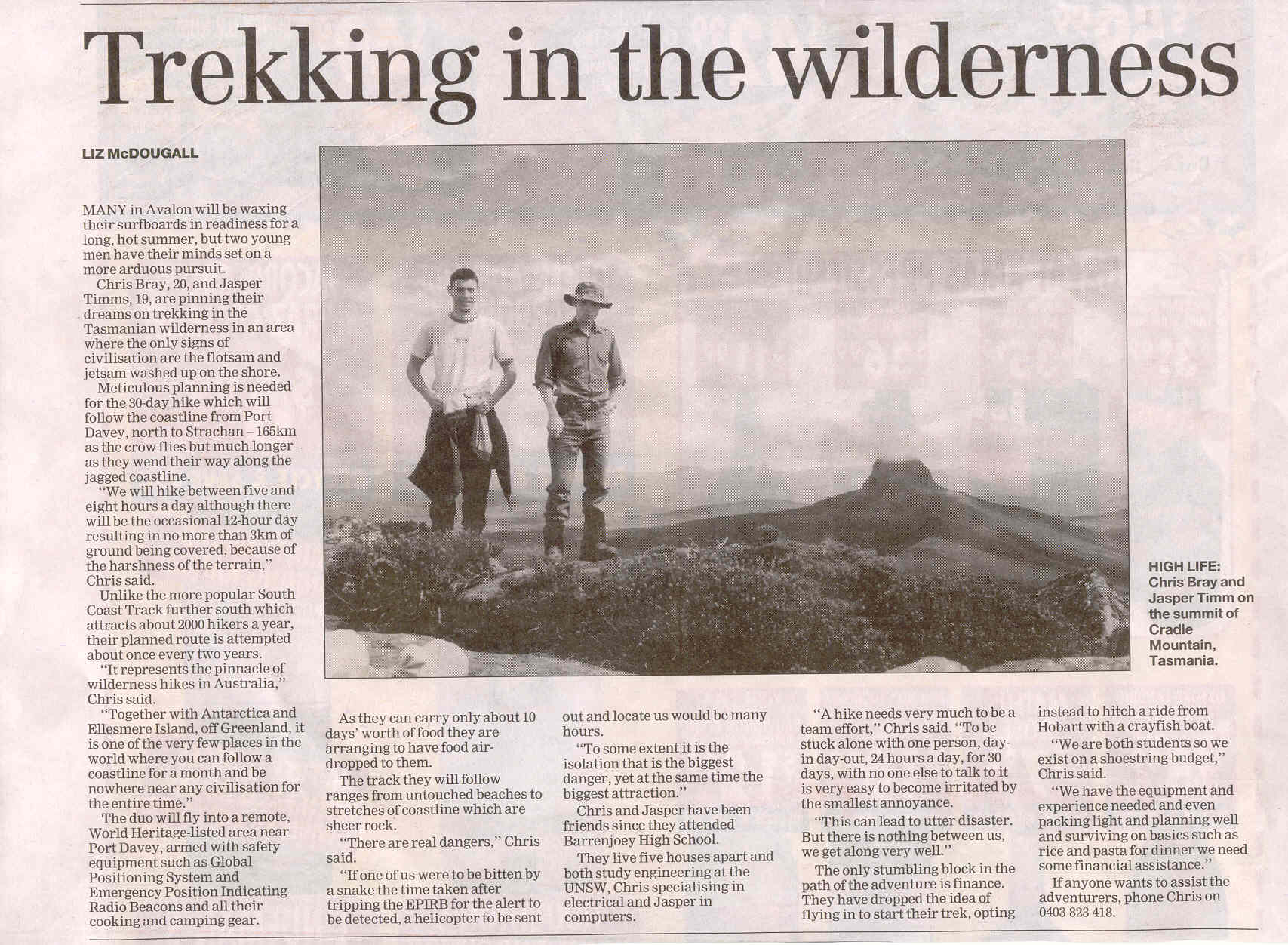 Before we left, the Manly Daily also published an article on our proposed hike on Wednesday 17th December 2003, illustrated with a photo we took on a previous Tasmanian hike to the Overland Track.
