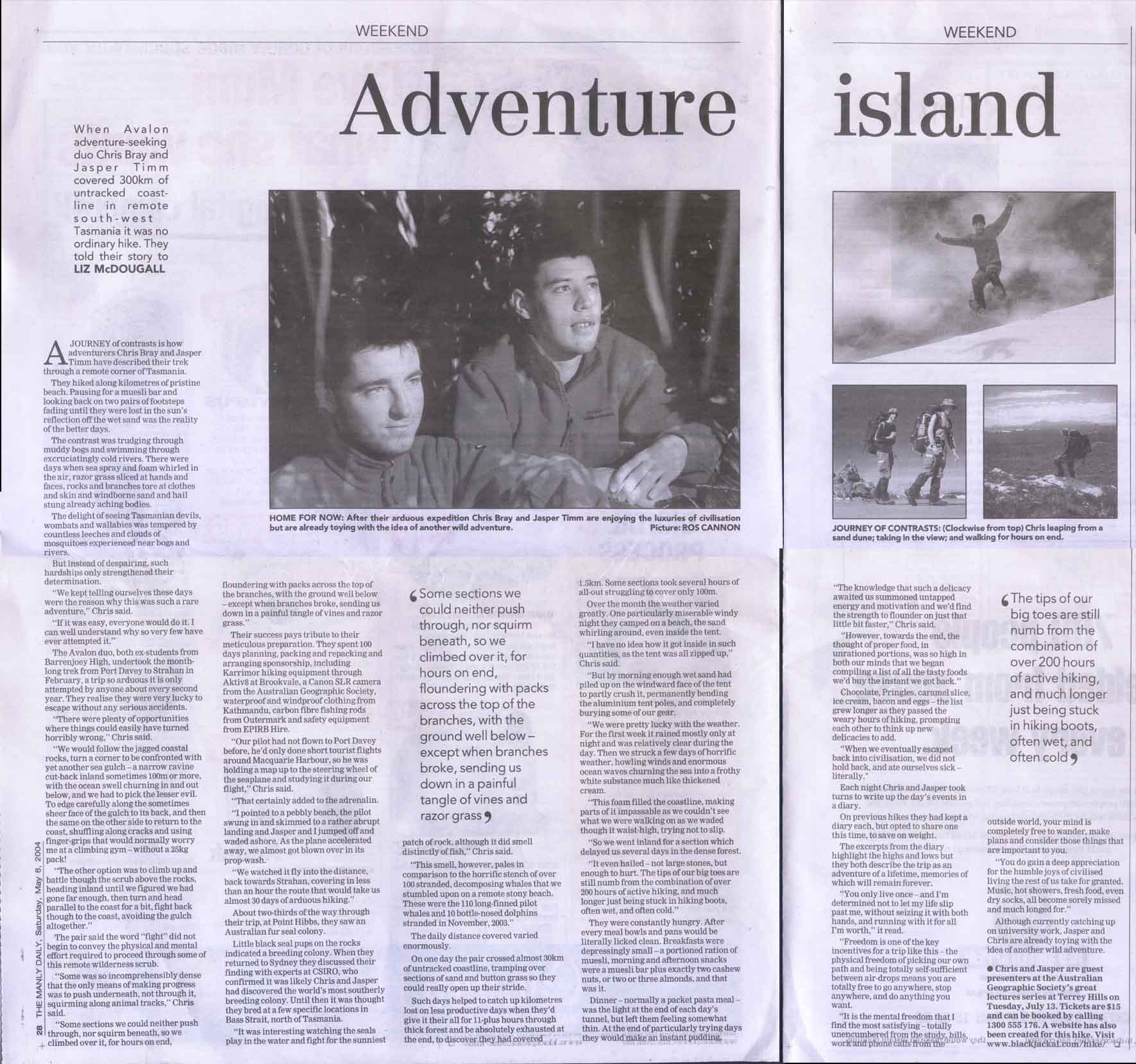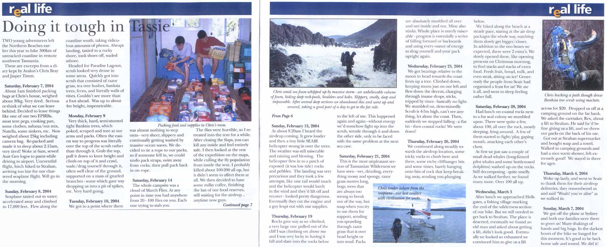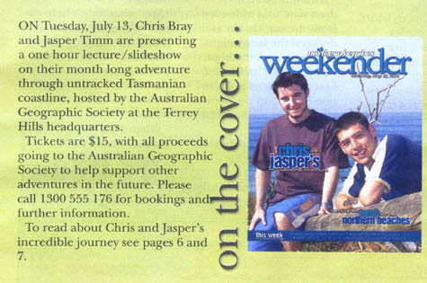 The Northern Beaches Weekender, also published a 2-page full colour spread on our adventure, and also placed our photo on the cover. The story consists mostly of hike diary excerpts and photographs. This issue came out on Thursday 13th May 2004.